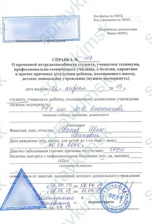 Подлинность документа заверяется прямоугольной печатью медицинского учреждения, круглым штампом терапевта или педиатра, прямоугольной печатью клиники и подписью лечащего врача. Медсправку о болезни могут заполнить в городской поликлинике или ином мед. учреждении.