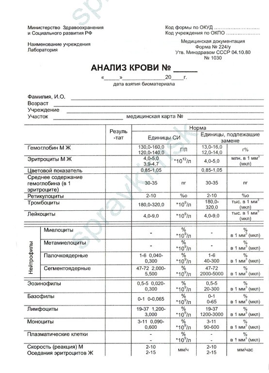 Справка 224/у (общий анализ крови) это медицинский документ, который позволяет узнать состояние организма, наличие вирусных инфекций, воспалительных процессов, которые протекают в процессе заболевания. Общий анализ крови по форме 224 у подразумевает измерение уровня лейкоцитов, эритроцитов, тромбоцитов, гемоглобина и гематокрита.