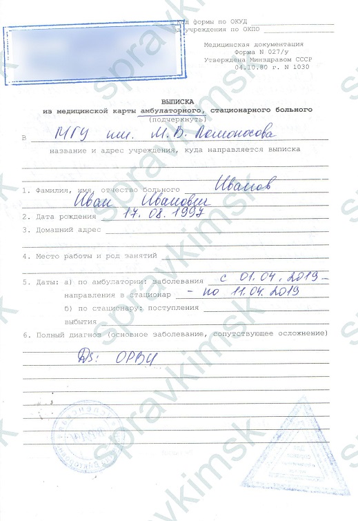 Пребывание в больничных стенах, когда потребовалась операция, реабилитация, обследование, фиксирует амбулаторная карта. Квалифицированную помощь может предоставить как коммерческая больница, так и государственное заведение здравоохранения. Все результаты врач записывает в бумажной или электронной форме 027/у. Датированная выписка содержит штамп с реквизитами заведения, треугольную печать, круглый оттиск специалиста и подпись. Данная справка основана на анализах, сообщает о проведённых исследованиях, в ней отмечается вариант лечения (больница или нахождение дома). Заполняются строки о ФИО, адресе проживания, работы или учёбы, дате рождения, месте требования, отрезке времени попадания в стационар, диагнозе и рекомендациях.